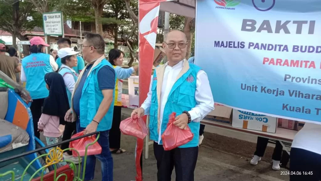 KABARTUNGKAL.COM. Kuala Tungkal – Guna memperkokoh kerukunan antar umat beragama di Kota Kuala tungkal , warga Tionghoa yang dipimpin Ko Ahong (Ketua Vihara Ksanti Maitreya Kuala Tungkal) membagi-bagikan takjil kepada umat Islam yang tengah melaksanakan ibadah puasa Ramadhan 1446 H/2024 M. Sabtu (06/04/2024) sekitar pukul 16:30 WIB