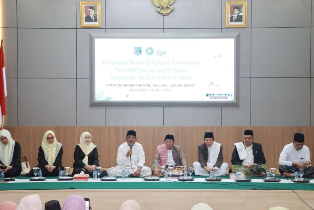 Sejalan dengan agenda tersebut, Ketua TP-PKK Tanjung Jabung Barat, Hj. Fadhilah Sadat, S.H., mengungkapkan bahwa pengajian rutin kali ini terasa istimewa karena bertepatan dengan peringatan Nuzulul Qur’an pada 17 Ramadan. Sebagai bentuk syukur, TP-PKK Kabupaten telah menyelesaikan khatam Al-Qur’an 30 juz.