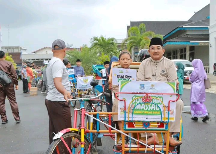 KABARTUNGKAL.COM. Kuala Tungkal . Suasana penuh kehangatan dan kepedulian terlihat saat Bupati Tanjung Jabung Barat, Drs. H. Anwar Sadat, M.Ag bersama Ketua TP-PKK Hj. Fadhilah Sadat mengiringi puluhan anak peserta sunatan massal menaiki becak dari Rumah Dinas Bupati menuju lokasi kegiatan di Gedung PKK, Senin (23/6). Iring-iringan becak tersebut menjadi simbol kedekatan pemimpin daerah dengan masyarakatnya, serta semangat kebersamaan dalam menebar manfaat sosial.