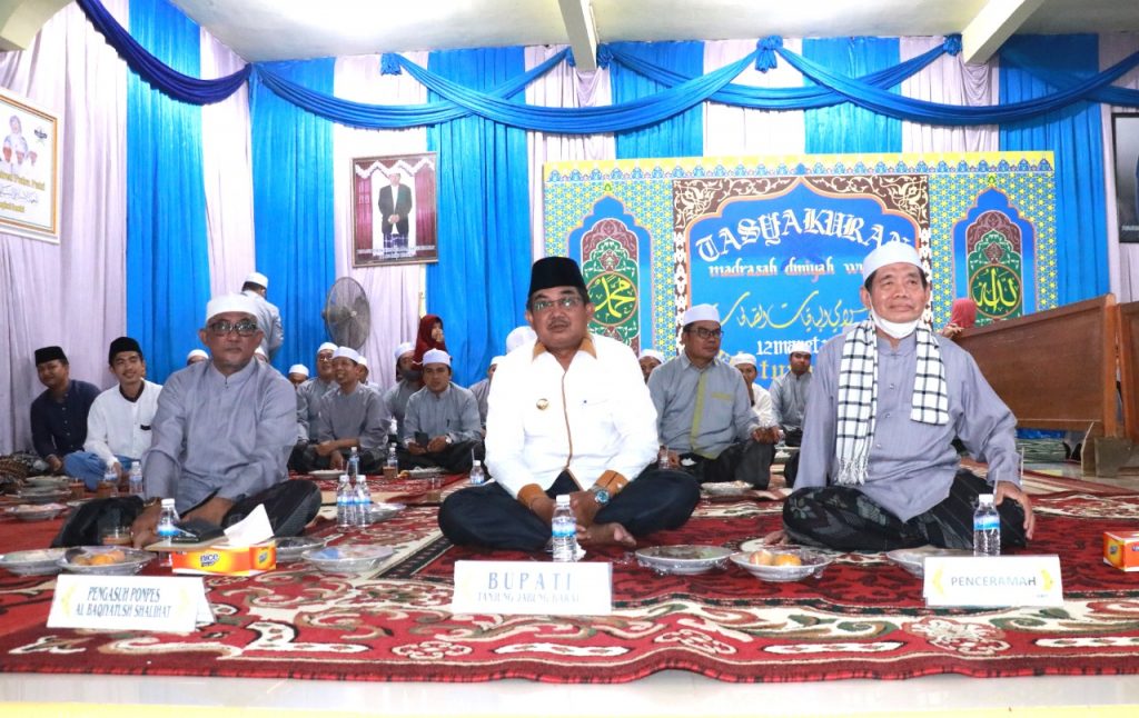 KABARTUNGKAL.COM . Bupati Tanjung Jabung Barat Drs. H. Anwar Sadat, M. Ag didampingi Ketua TP. PKK Hj. Fadhilah Sadat menghadiri perpisahan Santri Madrasah Tsanawiyah Pondok Pesantren Al-Baqiyatus Shalihat, Sabtu (13/03).
