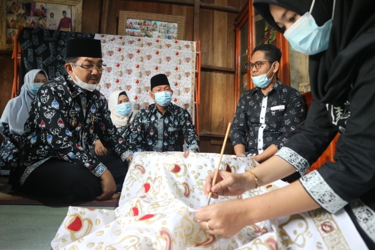 FTO : ( Bupati dan Wakil Bupati Kabupaten Tanjung Jabung Barat saat meninjau langsung pengrajin batik yang tengah memberikan motif pada kain)