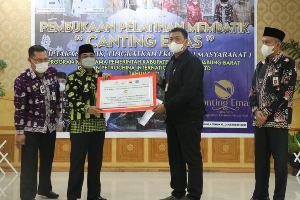 KABARTUNGKAL.COM . Bupati Kabupaten Tanjung Jabung Barat Drs. H.Anwar Sadat, M.Ag menghadiri sekaligus membuka acara Pelatihan Membatik bertajuk CANTING EMAS (Ciptakan Batik, Tingkatkan Ekonomi Masyarakat ) program kerjasama Pemerintah Kabupaten Tanjung Jabung Barat dengan Petrochina International Jabung LTD Tahun 2021. Kamis (21/10).