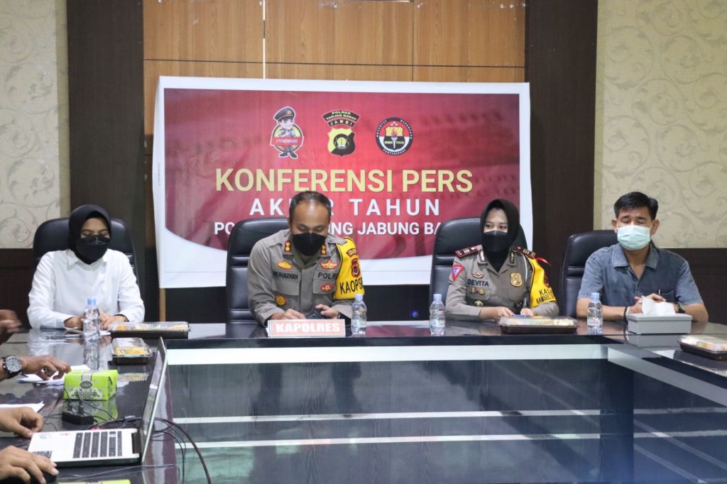 KABARTUNGKAL.COM . Kapolres Kabupaten Tanjung Jabung Barat, AKBP. Muharman Arta, S.I.K di dampingi Kasat Narkoba, Tony Al Tobing, SH dan beberapa Kasat memimpin langsung kegiatan press release akhir tahun 2021 yang berlangsung di makopolres Kabupaten Tanjung Jabung Barat. Jumat (31/12/21)