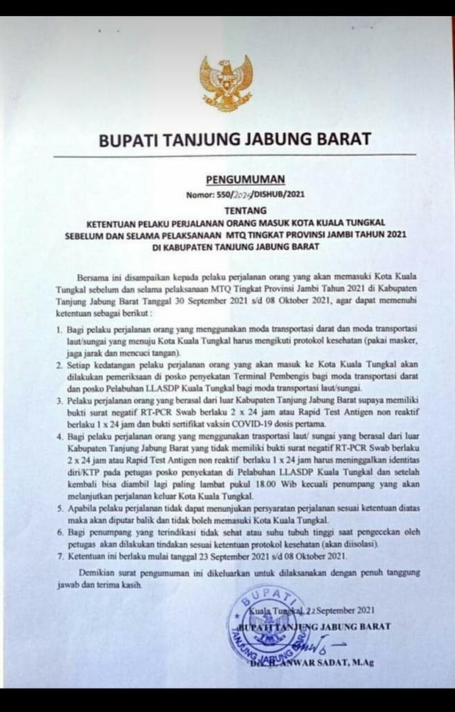 Berdasarkan pengumuman Bupati Tanjung Jabung Barat nomor : 550/2025/DISHUB/2021 tentang Ketentuan Pelaku Perjalanan Orang Masuk Kuala Tungkal, diberlakukan ketentuan bagi orang yang akan berkunjung ke Kota Kuala Tungkal tertanggal 30 September sampai 08 Oktober 2021 mendatang.