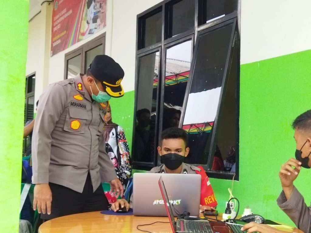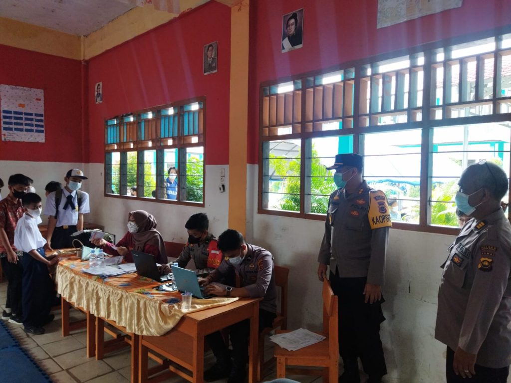 KABARTUNGKAL.COM . Kapolres Kabupaten Tanjung Jabung Barat, Ajun Komisaris Besar Polisi Muharman Arta, S.I.K bersama Wakapolres, Kompol Alhajat , S.I.K langsung melakukan pengecekan vaksinasi di sekolah yang sudah melakukan pembelajaran tatap muka (PTM) diantaranya SMP 1 Kuala Tungkal dan SMK 1 Kuala Tungkal . Senin (04/10/21)