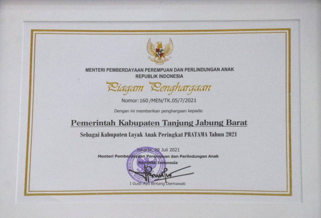 KARTUNGKAL.COM. Pemerintah Kabupaten Tanjung Jabung Barat raih penghargaan Kabupaten Layak Anak (KLA) Tingkat Pratama dari Kementerian Pemberdayaan Perempuan dan Perlindungan Anak (PPPA) Republik Indonesia, Jakarta (12/10).