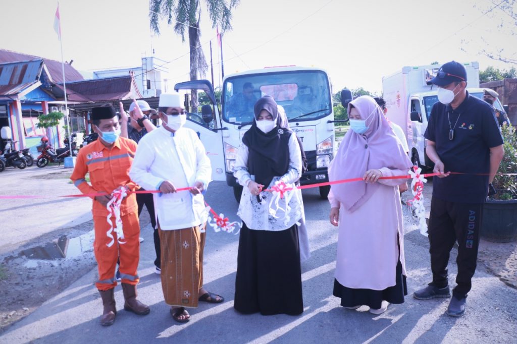 KABARTUNGKAL.COM. Bupati Tanjung Jabung Barat Drs.H. Anwar Sadat M, Ag resmikan rute jalur operasional mobil penanganan sampah untuk wilayah ulu yang meliputi lima Kecamatan. Peresmian rute ini ditandai dengan pengguntingan pita oleh Ketua TP-PKK Hj. Umi Fadilah Sadat. Jum’at 21/1/22