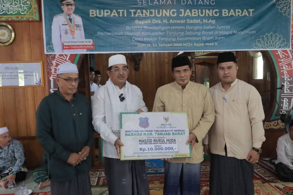 Menutup kegiatan Safari Jumat, Bupati Anwar Sadat menyerahkan bantuan untuk pembangunan Masjid Nurul Huda sebesar Rp 10 juta yang berasal dari dana yang dikelola BAZNAS Tanjab Barat. Selain itu, diberikan juga santunan bagi anak yatim, bantuan untuk takmir masjid, serta paket sembako kepada kaum dhuafa, dan paket kesehatan untuk anak stunting dari Dinas Kesehatan. Tindakan ini merupakan wujud kepedulian Pemkab Tanjab Barat terhadap masyarakat kurang mampu dan menunjukkan komitmen untuk mewujudkan keadilan dan kesejahteraan bagi semua warga Tanjab Barat.