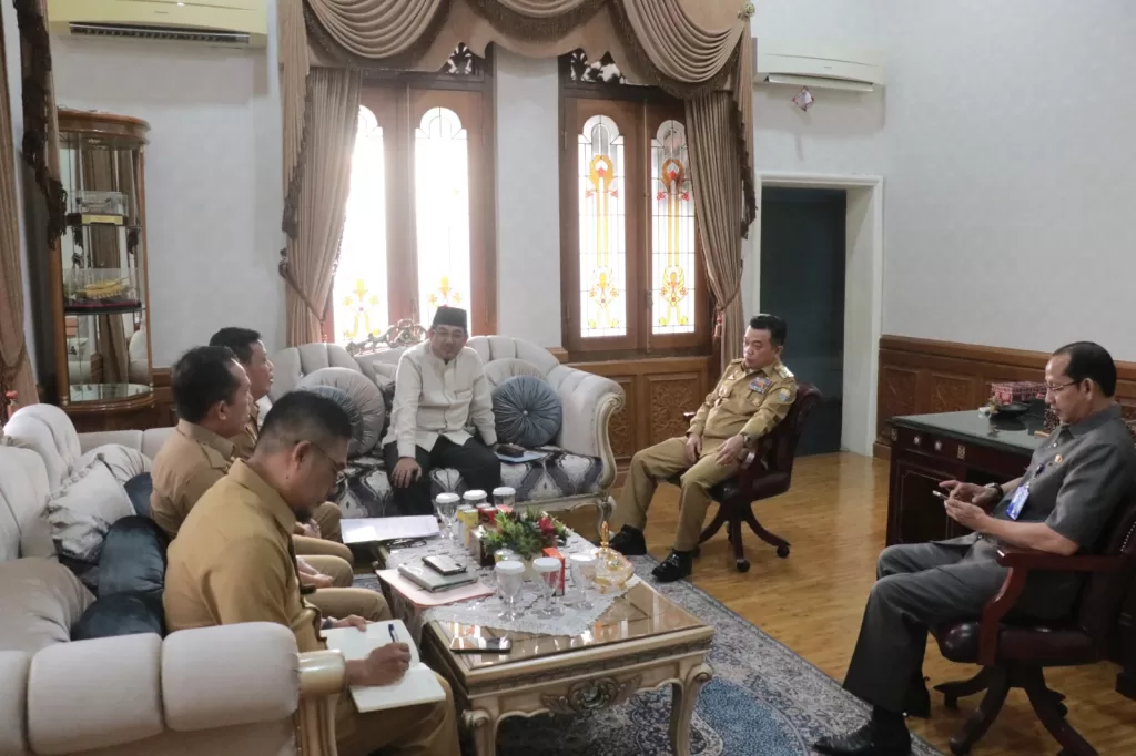 KABARTUNGKAL. COM . Bupati Tanjab Barat Drs. H. Anwar Sadat M, Ag langsung melakukan pertemuan bersama Gubernur Jambi dalam rangka membahas tata niaga komoditi pinang di Kabupaten Tanjab Barat yang digelar di Ruang kerja rumah Dinas Gubernur Jambi. Selasa 4/7/2023.
