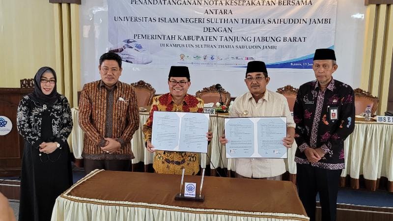 Kerjasama ditandai dengan ditandatangai Nota Kesepahaman antara Bupati Tanjab Barat Drs. KH. Anwar Sadat, M.Ag dengan Prof. Dr. H. Suaidi Asyari, MA, Ph.D di Gedung Rektorat UIN Jambi, Kamis (13/1/22).
