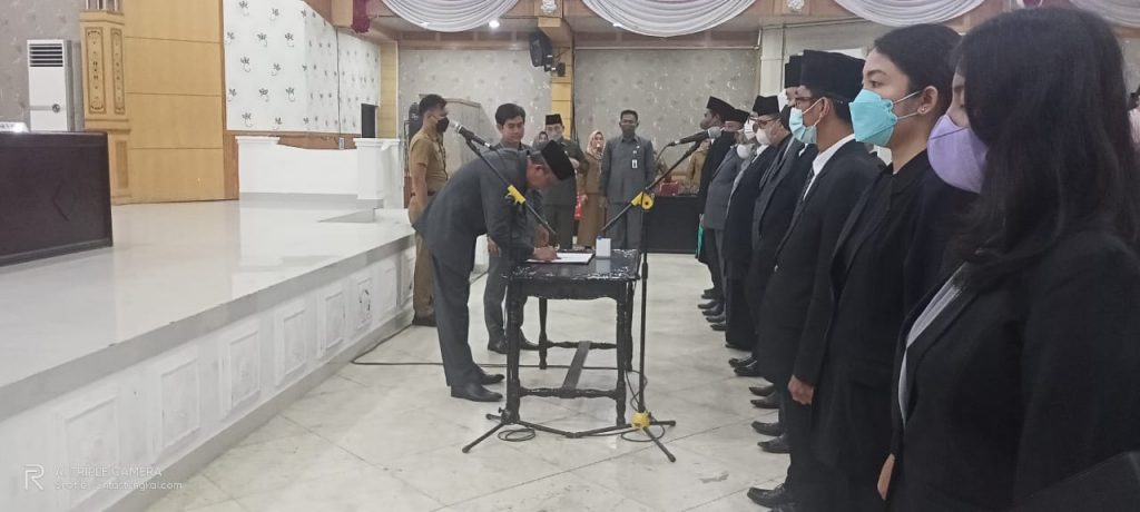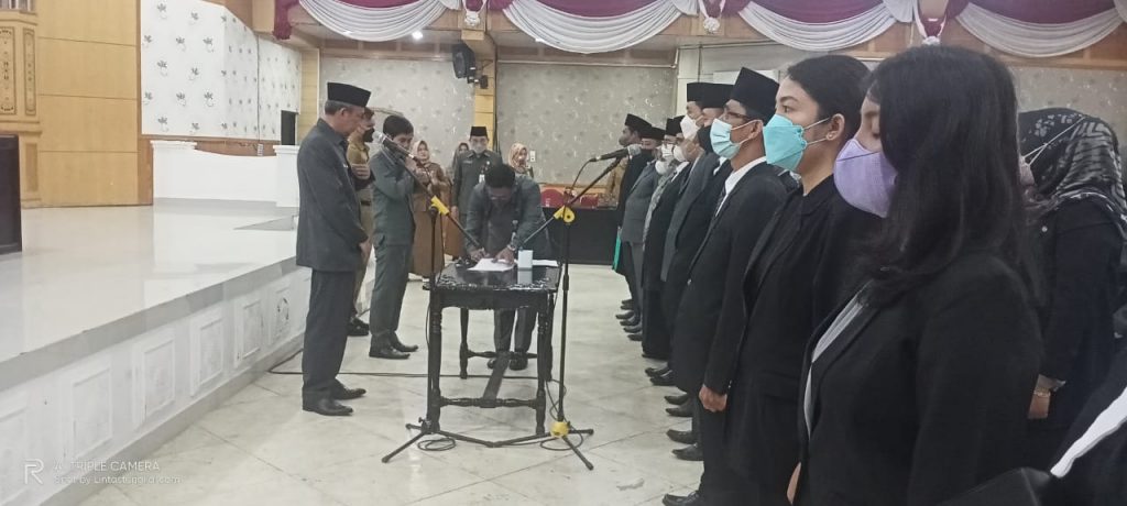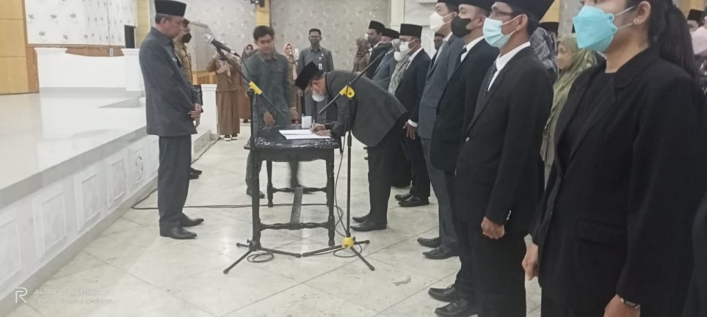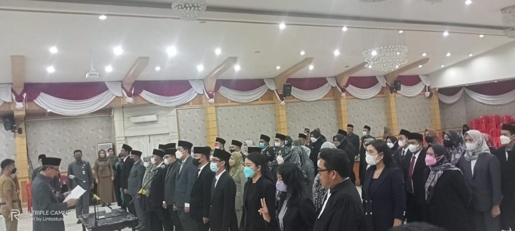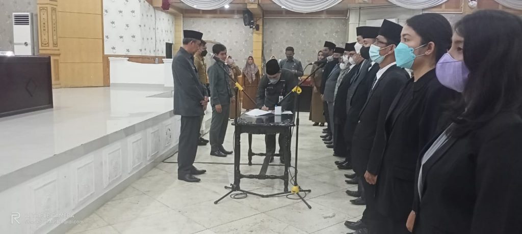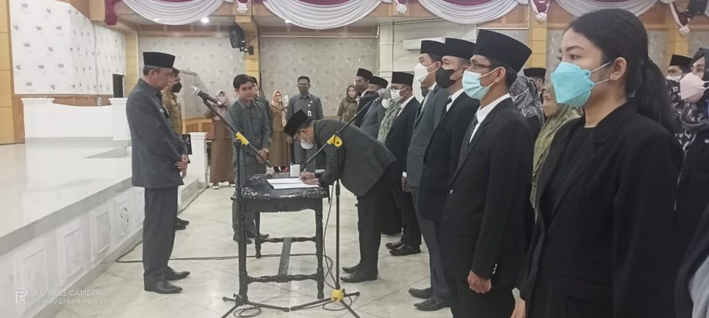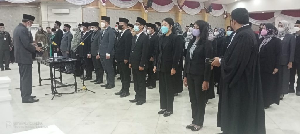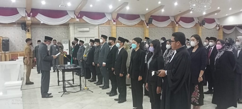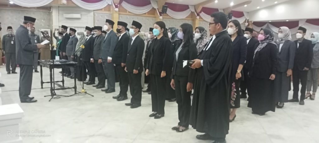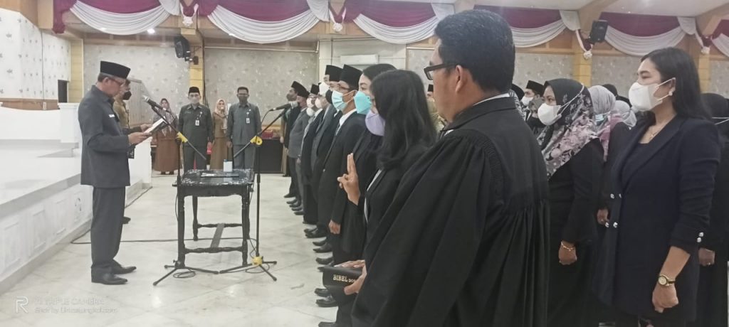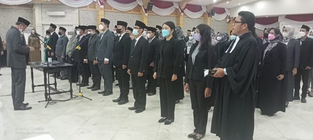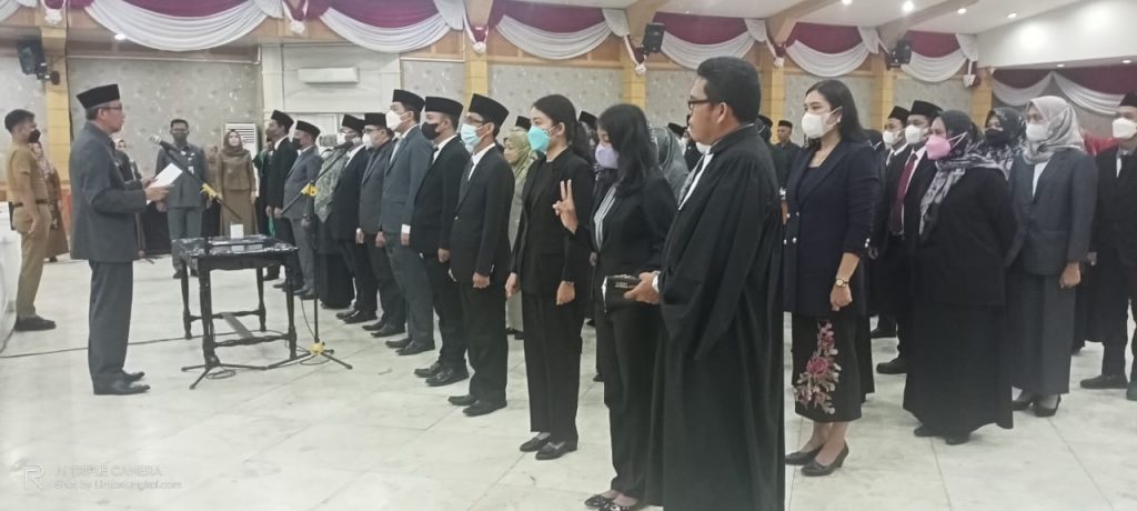 Proses pelantikan dan pengambilan sumpah Jabatan dipimpin langsung oleh Sekretaris Daerah (Sekda) Tanjung Jabung Barat H Agus Sanusi di Balai Pertemuan Kantor Bupati Tanjung Jabung Barat, Jambi, Senin (23/5/22).