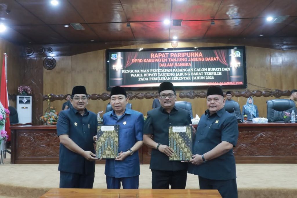 KABARTUNGKAL.COM. Tanjung Jabung Barat – Dewan Perwakilan Rakyat Daerah (DPRD) Kabupaten Tanjung Jabung Barat menggelar rapat paripurna dalam rangka pengumuman dan penetapan pasangan calon Bupati dan Wakil Bupati terpilih pada Pemilihan Kepala Daerah (Pilkada) Serentak Tahun 2024. Selasa (14/1).
