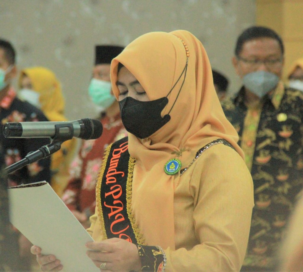 KABARTUNGKAL.COM . Umy Hj. Fadhilah Sadat memimpin Pengukuhan Pokja Bunda Paud Kabupaten Tanjung Jabung Barat di balai pertemuan kantor bupati, Kamis ( 23/09/21).
