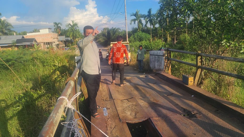 KABARTUNGKAL.COM. Wakil Bupati Tanjung Jabung Barat, Dr. H. Katamso SA, S.E., M.E., melakukan peninjauan langsung terhadap kondisi jembatan di Desa Kemuning, Kecamatan Bram Itam, pada Jumat (13/6/2025).
