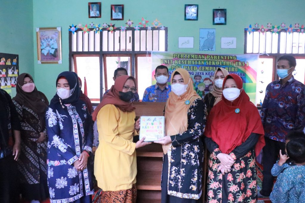 Acara dilanjutkan dengan Peneyerahan bantuan literasi berupa 1 buah lemari dan 40 buku baca oleh Bunda Paud kabupaten tanjung jabung barat kepada ketua pengelola pos paud Cempaka Biru.