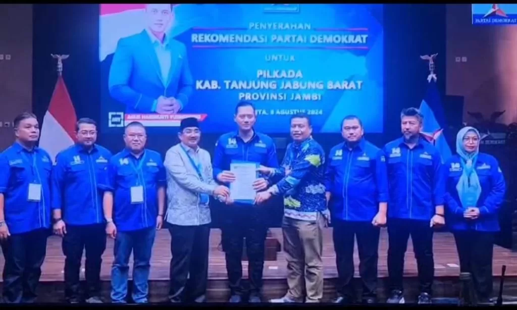 KABARTUNGKAL.COM, TANJABBARAT – DPP Partai Demokrat secara resmi menyerahkan surat rekomendasi untuk pasangan Ustad Anwar Sadat (UAS) – Katamso sebagai calon Bupati dan Wakil Bupati Tanjung Jabung Barat dalam Pilkada 2024.