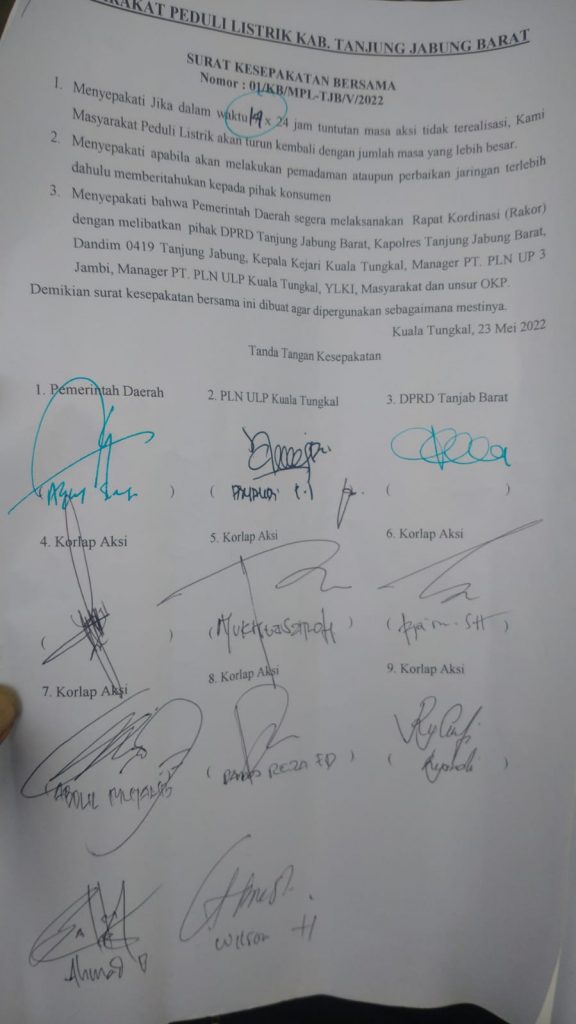 Lebih lanjut ia pun menilai pihak PLN Rayon Kuala Tungkal telah mengingkari kesepakatan yang telah di buat secara tertulis.