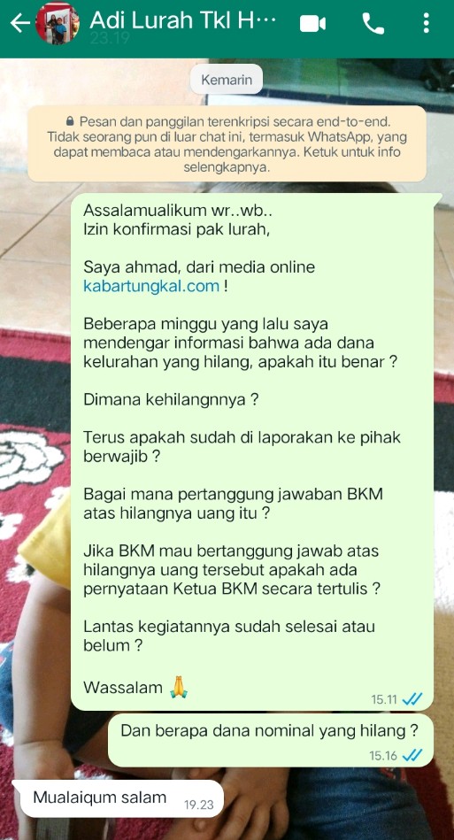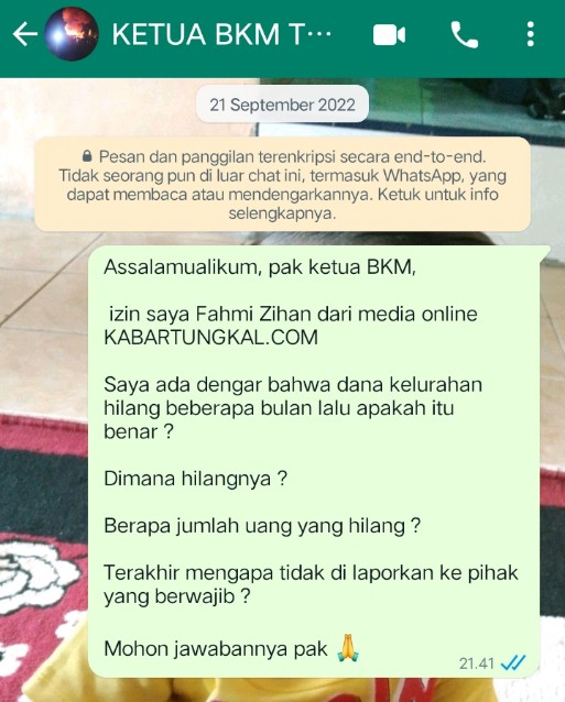 Selanjutnya awak media pun berusaha menghubungi ketua BKM guna memastikan hilangnya dana kelurahan tersebut secara detail, namun disayangkan ketua BKM memilih bungkam saat di konfirmasi awak media via whatApp-nya.
