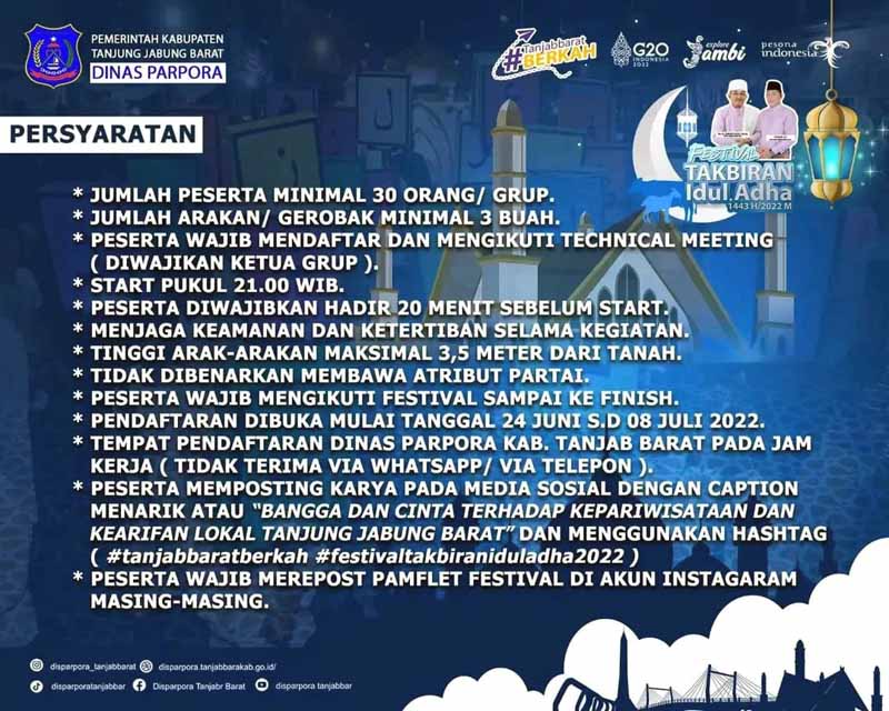 KABARTUNGKAL.COM . Beredar luas informasi festival arakan takbiran Idul Adha 1443 akan di gelar oleh pemerintah Kabupaten Tanjung Jabung Barat.