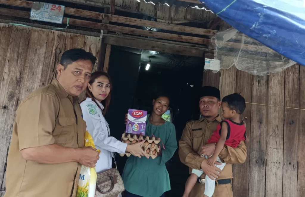 KABARTUNGKAL.COM. Guna mengurangi angka stunting di kelurahan Tungkal Harapan Kabupaten Tanjung Jabung Barat, Provinsi Jambi, Nur Hadiansyah, S.Kom.I selaku Lurah didampingi Kasi Pembangunan juga pihak Puskesmas pembantu kembali turun menemui warga untuk menyerahkan bantuan sembako berupa beras, susu juga telur bagi anak-anak yang masuk dalam kategori stunting.