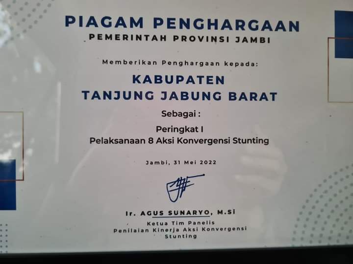 KABARTUNGKAL.COM . Kabupaten Tanjab Barat keluar sebagai peringkat pertama dalam penurunan angka stunting se-Provinsi Jambi di tahun 2022. Piagam penghargaan diterima langsung oleh Sekda Tanjab Barat Agus Sanusi, Selasa (31/5/22).
