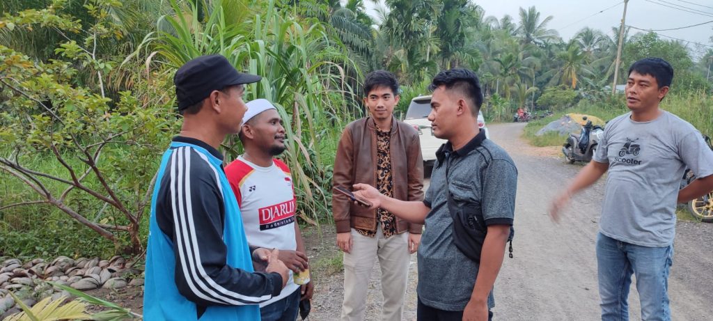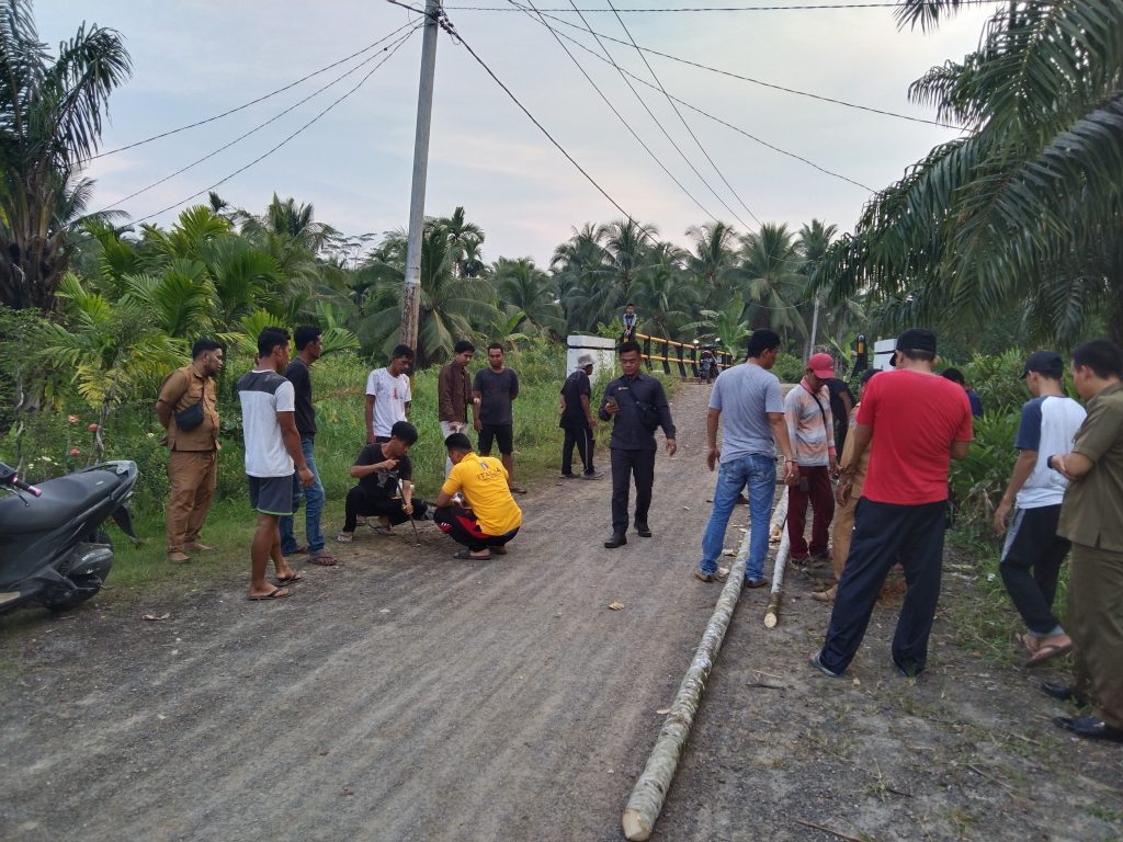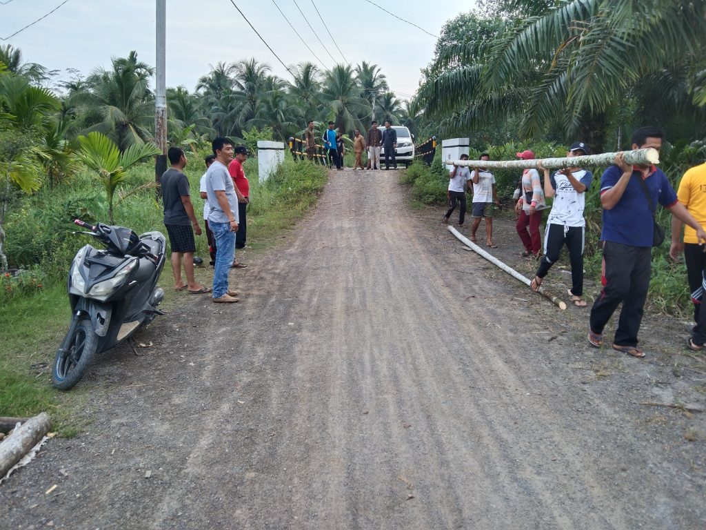 Usai menyampaikan terkait pemasangan portal di hadapan Kepala Desa dan Sekdes tidak lama sekitar 15 orang warga datang membawa alat-alat juga batang pinang yang siap di pasang.