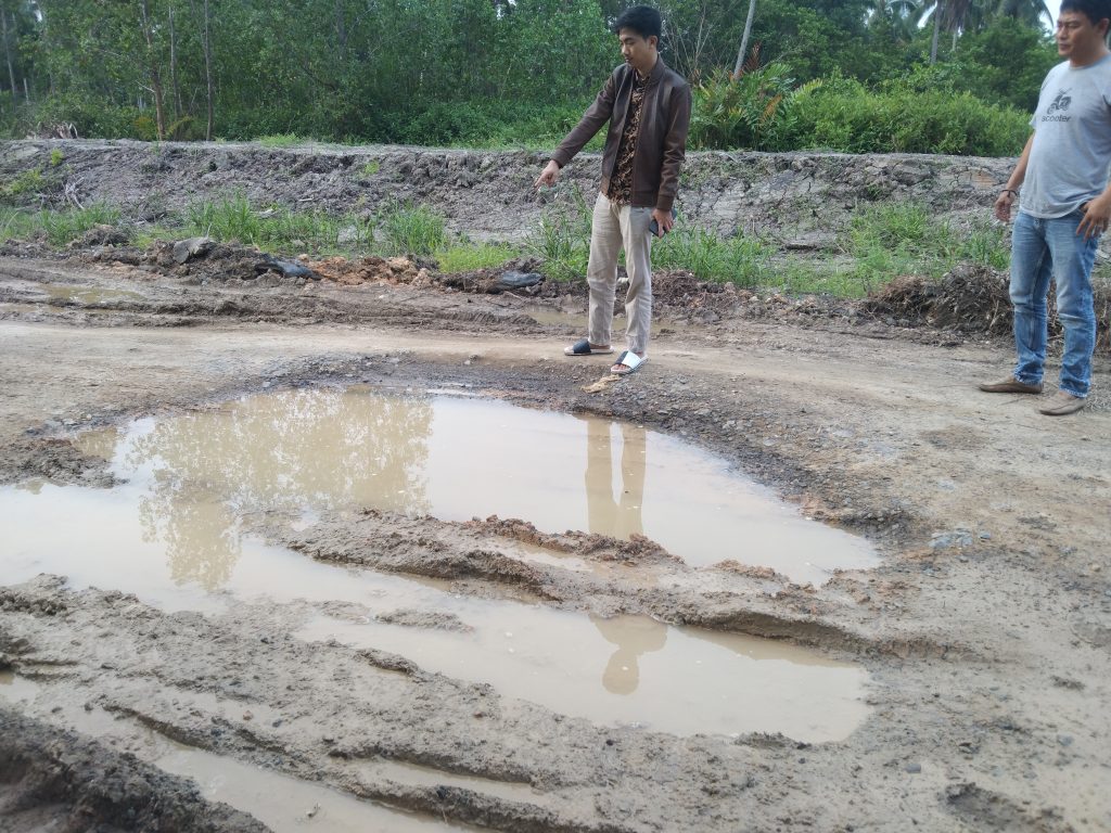 KABARTUNGKAL.COM . Menindaklanjuti laporan warga desa Tanjung Senjulang Ketua Karang Taruna Kabupaten Tanjung Jabung Barat, Muhammad Adib Mubarok, S. Pd bergegas turun ke lokasi untuk segera mengecek kondisi jalan yang rusak, di duga akibat mobil yang mengangkut sawit melebihi tonase.