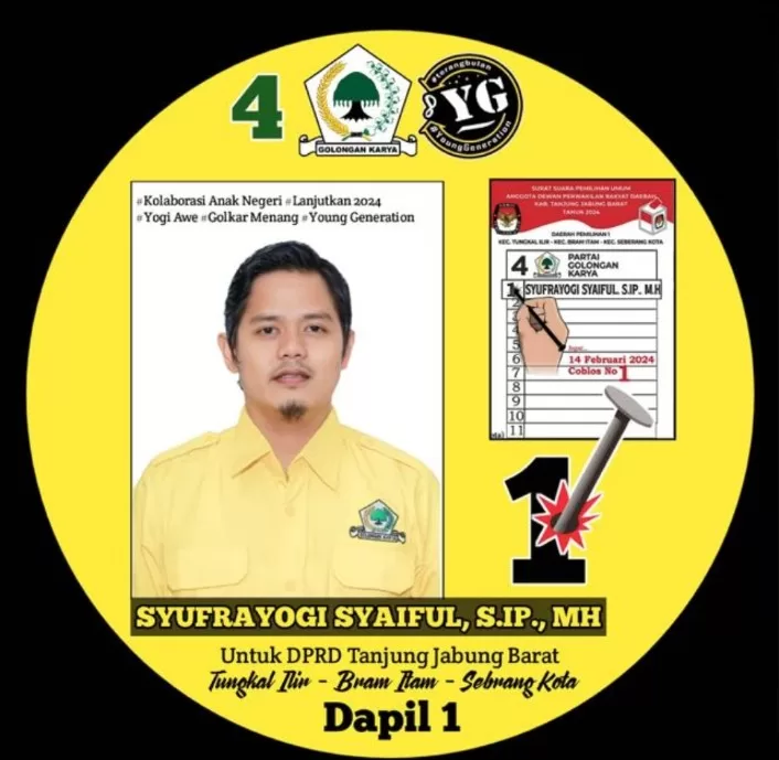 Untuk diketahui, Syufrayogi Syaiful, S.IP, MH kembali maju mencalonkan diri sebagai Calon Legeslatif (CALEG DPRD) Kabupaten Tanjung Jabung Barat mewakili suara masyarakat di dapil I (Satu) meliputi Kecamatan Tungkal Ilir, Kecamatan Bram Itam dan Kecamatan Sebrang kota dari partai Golongan Karya (GOLKAR) diposisi nomor 1 (Satu).