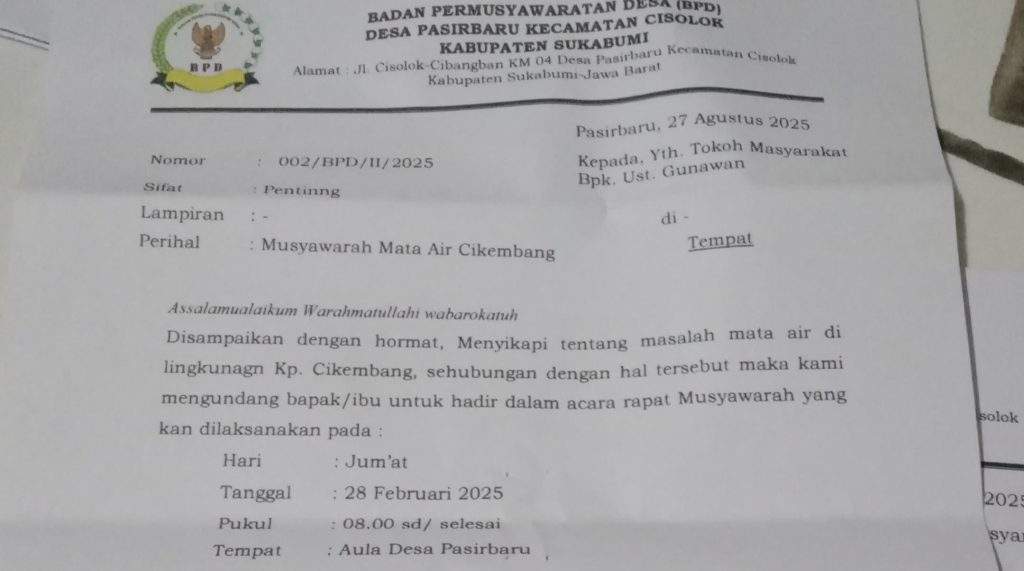 Hal itu dituangkan ketua BPD, Dendi Suheni, S.IP dalam bentuk surat undangan resmi rapat musyawarah yang ditembuskan kepada camat Cisolok, Kepala Desa Pasir Baru, Babinkamtibmas Desa Pasir Baru dan Babinsa Desa Pasir Baru.